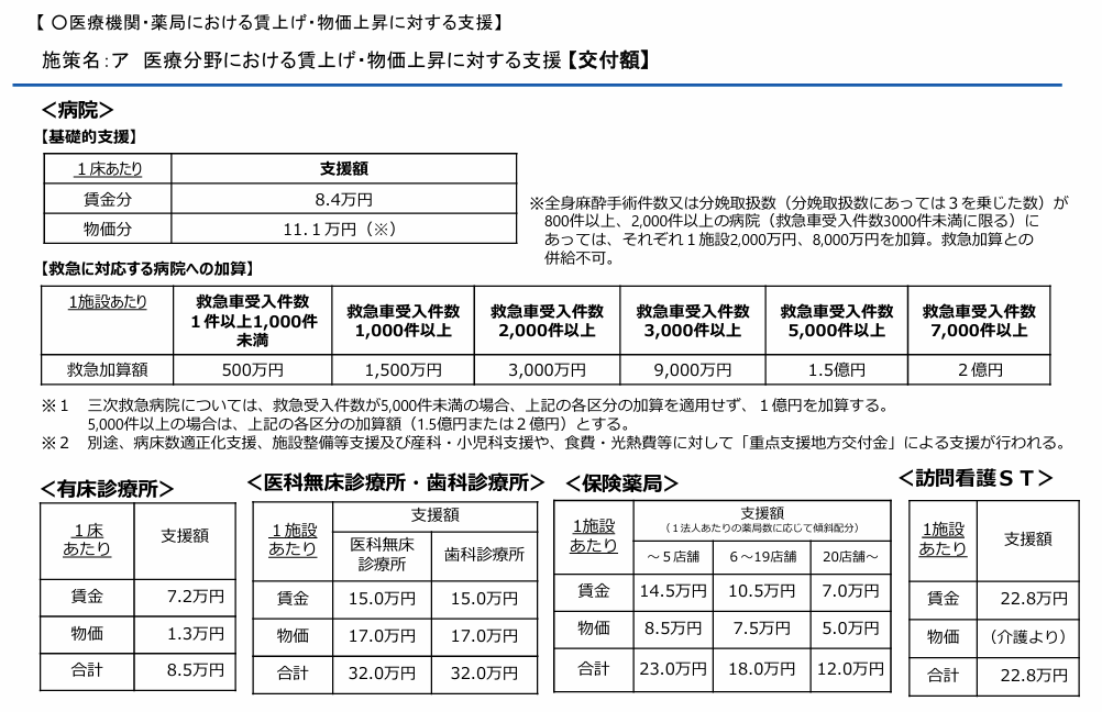 医療機関・薬局の処遇改善支援です。交付額は下図のとおりで、予算成立後、速やかに実施されるスケジュールです。